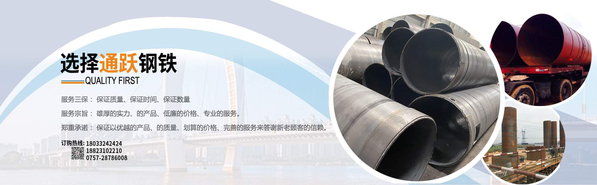 佛山市通躍鋼鐵有限公司 電話188-2310-2210 0757-28786008 擁有多條美國先進的螺旋鋼管生產線,生產直徑φ159-φ3620mm(壁厚6mm-20mm)的雙面埋弧螺旋焊鋼管,年生產能力15萬噸。 生產螺旋管 螺旋鋼管 螺旋焊管 規格厚度6mm-20mm 直徑159mm-3620mm 有多條鋼板卷管機生產規格厚度6mm-70mm 直徑400mm-5020mm 螺旋管 螺旋鋼管 鋼護筒 焊接鋼護筒 鋼板卷管 丁字焊管 加工格構柱 鋼管樁 材質Q235B Q345B Q235A 45# 20# Q420D Q390D 錳板 歡迎來電報價,公司配有大型型材 鋼板倉庫,大量各種規格現貨H型鋼 槽鋼 角鋼 工字鋼 鋼板,鍍鋅方管 鍍鋅產品 產品可以定尺定長,提供打砂,除銹,上油漆,公司配有防腐加工廠,專業對鋼管進行內外壁防腐加工,鋼管外壁主要有三油兩布,五油三布,環氧煤瀝青及環氧樹脂漆,各種高分子涂料。 ......